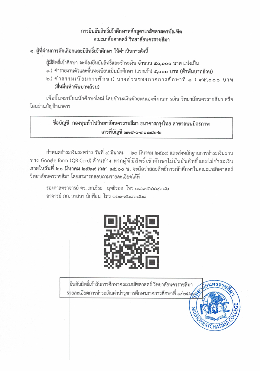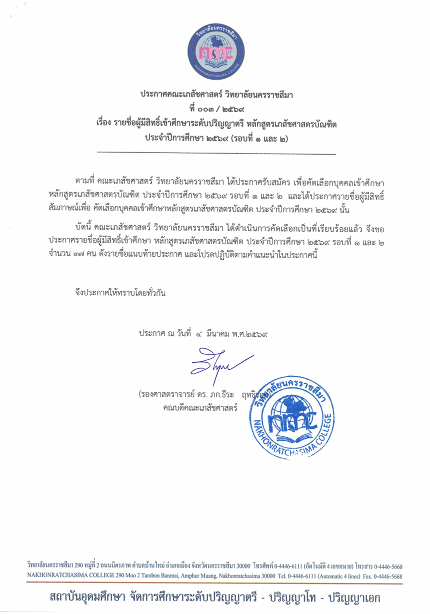 : ประกาศรายชื่อผู้มีสิทธิ์เข้าศึกษาระดับปริญญาตรี หลักสูตรเภสัชศาสตรบัณฑิต ปีการศึกษา 2569 (รอบที่ 1 และ รอบที่ 2)