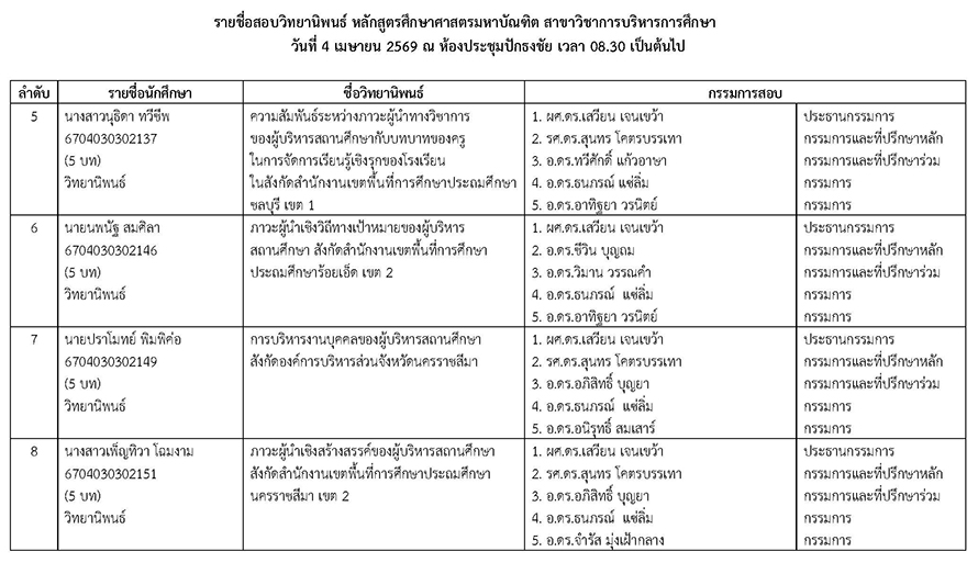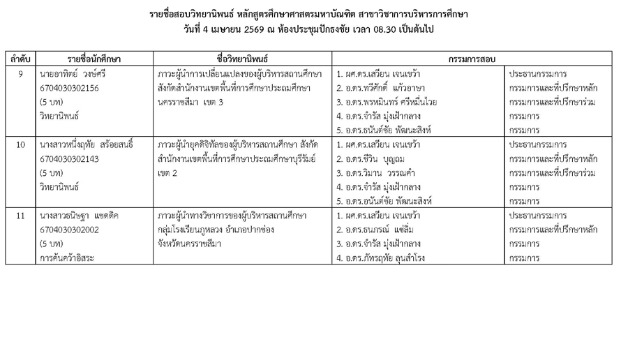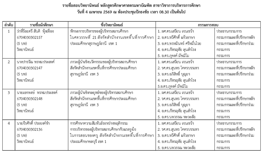 หัวข้อ : ประกาศรายชื่อสอบวิทยานิพนธ์ หลักสูตรศึกษาศาสตรมหาบัณฑิต สาชาวิชาการบริหารการศึกษา วันเสาร์ที่ 4 เมษายน 2569 ณ ห้องประชุมปักธงชัย เวลา 08.30 น. เป็นต้นไป